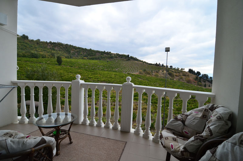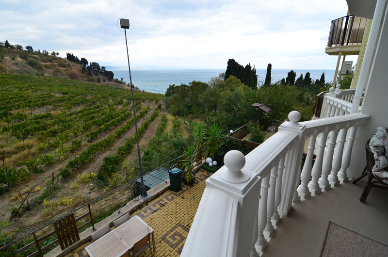 Просторный балкон со столом и стульями и панорамным видом на холмы, виноградник и море обеспечат Вам незабываемый отдых на ЮБК у моря!